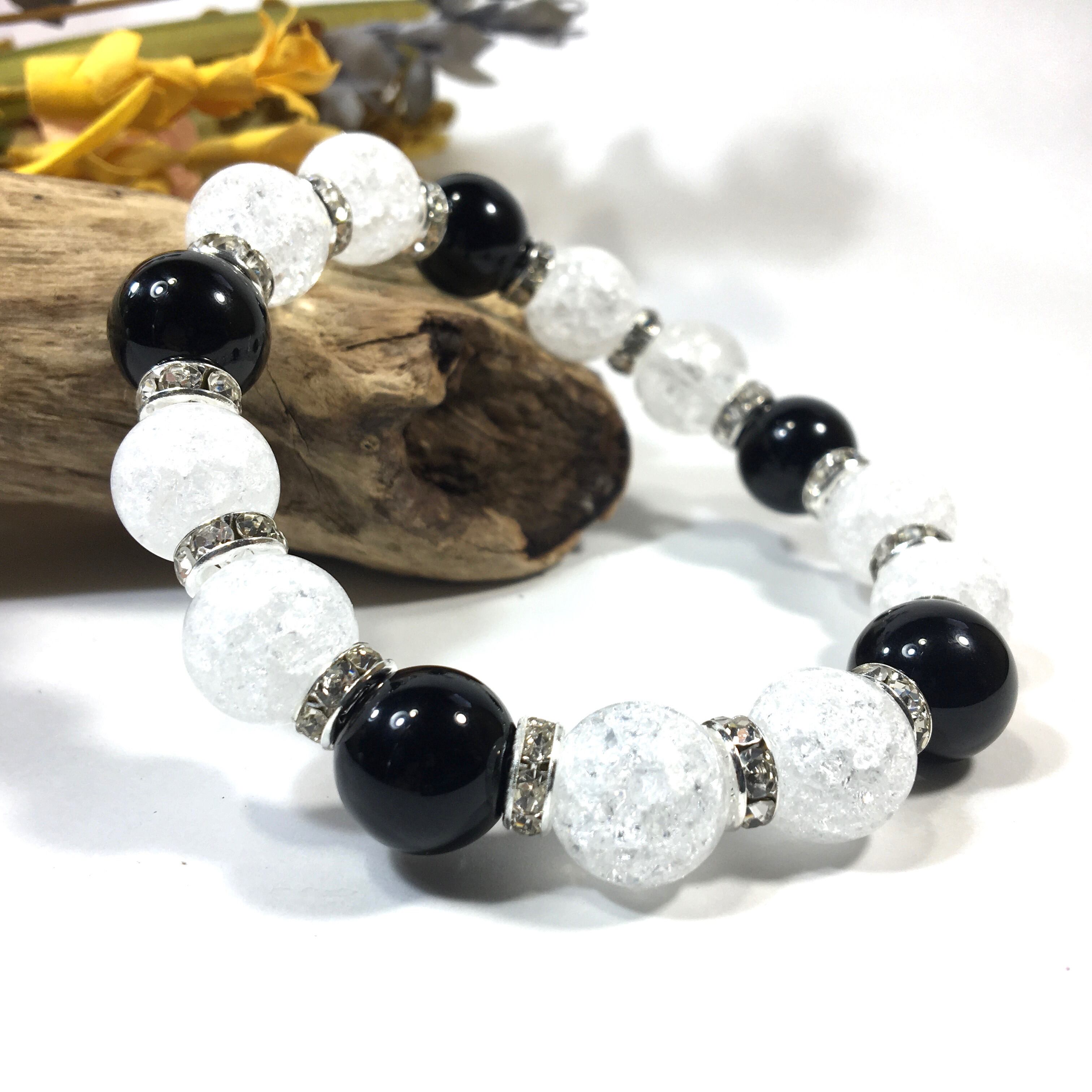 こちらは、クラック水晶とオニキスを組み合わせたパワーストーンブレスレットです。間にはロンデルを挟み高級感あるデザインに仕上げております。石大きさは12mm玉を使用して内周約18cmです。気になる方は是非この機会にどうぞ。