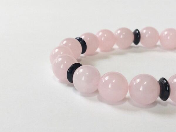 こちらは、10mm玉のローズクォーツを使用したブレスレットです。石との間に挟まれたオニキスのソロバンがアクセントになったデザインです。シンプルなデザインは使い勝手がよく、どんなコーディネートにも合わせやすいブレスレットです。石大きさは腕にも馴染みやすいように10mm玉で内周約16cmです。(オペロンゴムのため伸縮性があります) 数に限りがございますので気になる方はお早めにどうぞ。