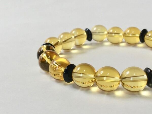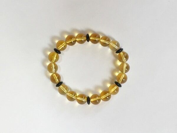 こちらは、10mm玉のシトリンを使用したブレスレットです。石との間に挟まれたオニキスのソロバンがアクセントになったデザインです。シンプルなデザインは使い勝手がよく、どんなコーディネートにも合わせやすいブレスレットです。石大きさは腕にも馴染みやすいように10mm玉で内周約16.5cmです。(オペロンゴムのため伸縮性があります) 数に限りがございますので気になる方はお早めにどうぞ。