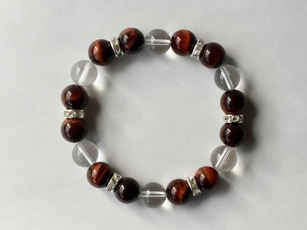 こちらは、10mm玉のレッドタイガーアイと水晶を使用した天然石ブレスレットです。間にはロンデルを挟み高級感ある仕上がりです。石大きさは腕にも馴染みやすいように10mm玉で内周約17cm(伸可能)です。気になる方は是非この機会にどうぞ。