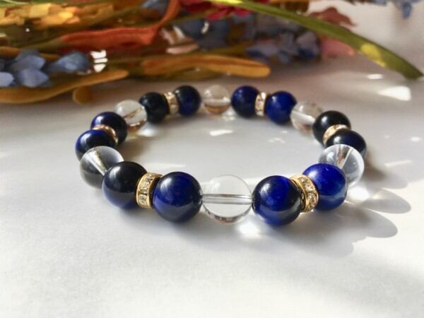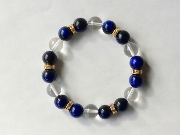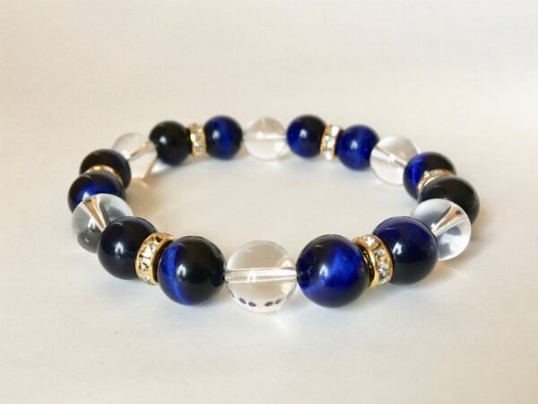 こちらは、10mm玉のブルータイガーアイと水晶を使用した天然石ブレスレットです。間にはロンデルを挟み高級感ある仕上がりです。石大きさは腕にも馴染みやすいように10mm玉で内周約17cm(伸可能)です。気になる方は是非この機会にどうぞ。