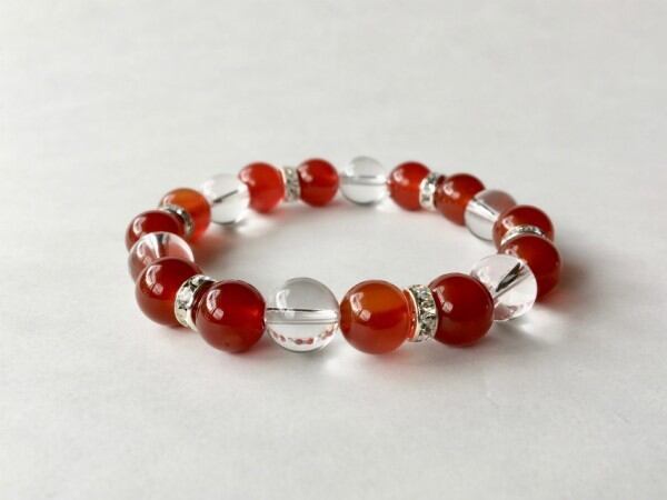 こちらは、10mm玉の赤瑪瑙と水晶を使用した天然石ブレスレットです。間にはロンデルを挟み高級感ある仕上がりです。石大きさは腕にも馴染みやすいように10mm玉で内周約17cm(伸可能)です。気になる方は是非この機会にどうぞ。