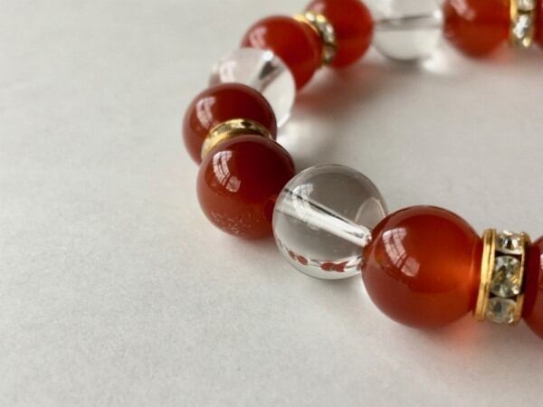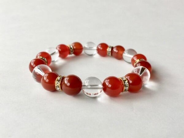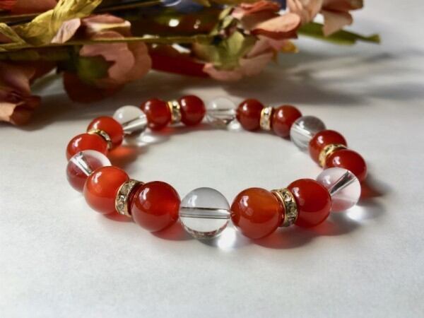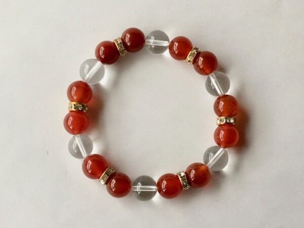 こちらは、10mm玉の赤瑪瑙と水晶を使用した天然石ブレスレットです。間にはロンデルを挟み高級感ある仕上がりです。石大きさは腕にも馴染みやすいように10mm玉で内周約17cm(伸可能)です。気になる方は是非この機会にどうぞ。