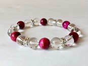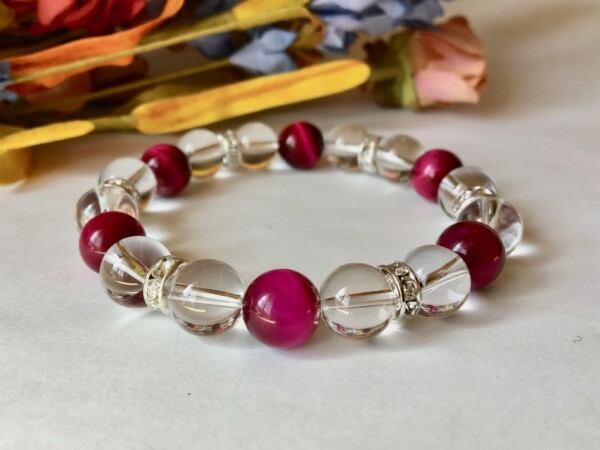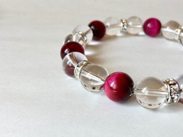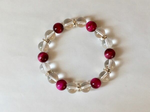 こちらは、10mm玉の水晶とピンクタイガーアイを使用した天然石ブレスレットです。間にはロンデルを挟み高級感ある仕上がりです。石大きさは腕にも馴染みやすいように10mm玉で内周約17cm(伸可能)です。気になる方は是非この機会にどうぞ。