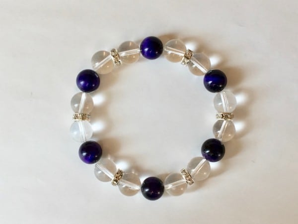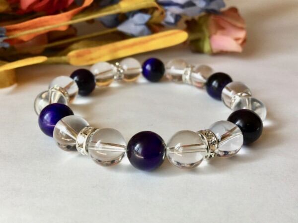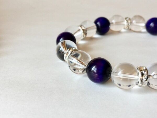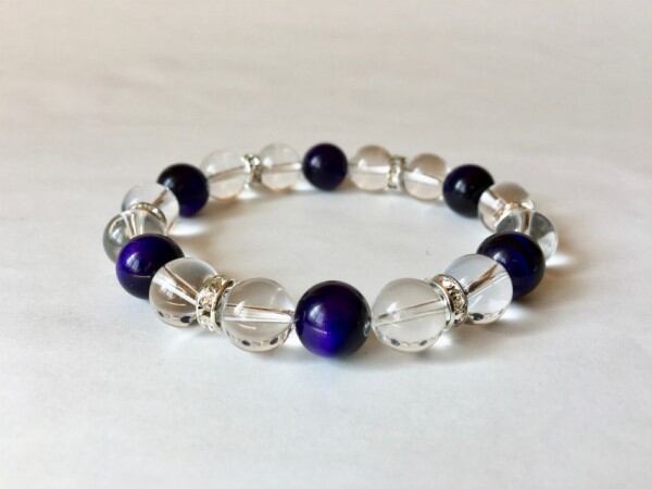 こちらは、10mm玉の水晶とパープルタイガーアイを使用した天然石ブレスレットです。間にはロンデルを挟み高級感ある仕上がりです。石大きさは腕にも馴染みやすいように10mm玉で内周約17cm(伸可能)です。気になる方は是非この機会にどうぞ。