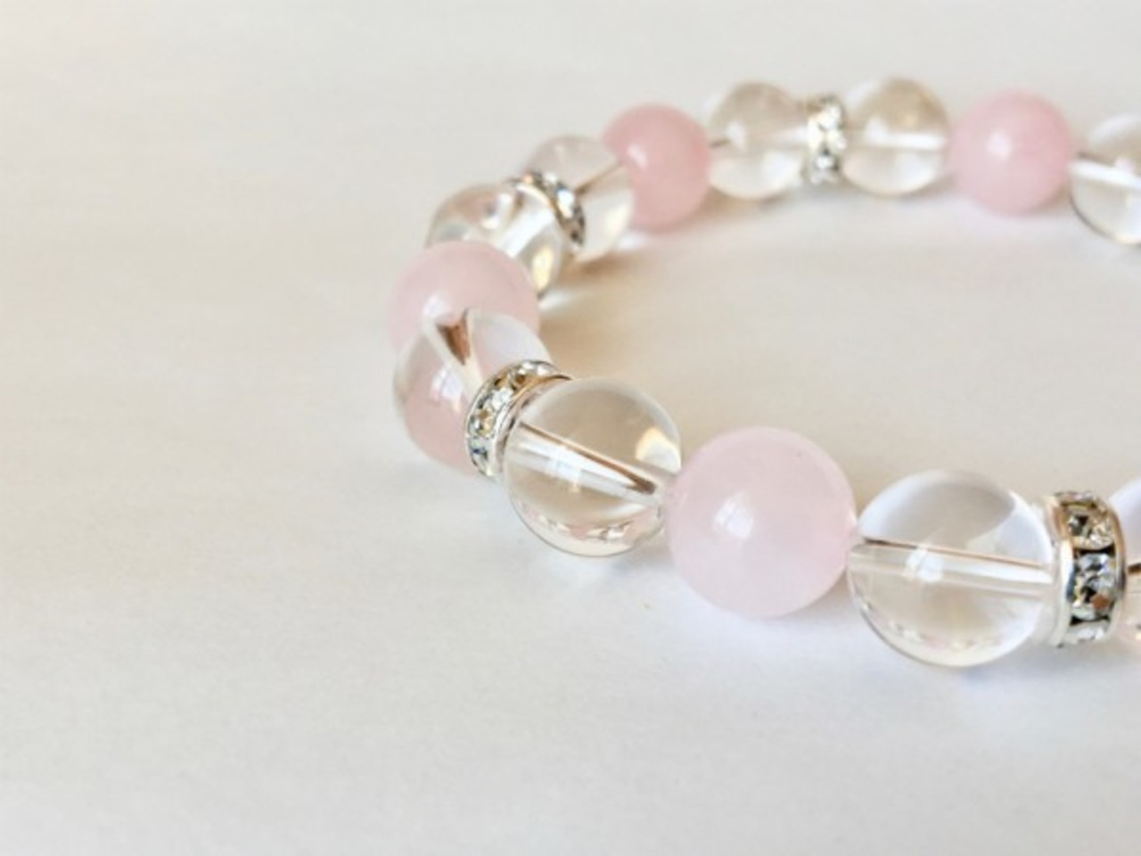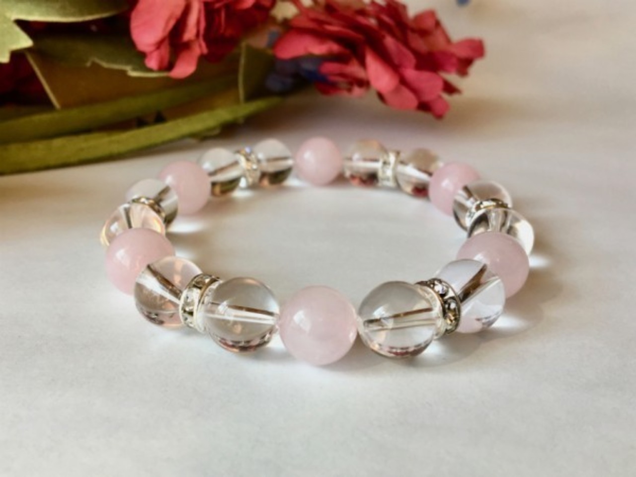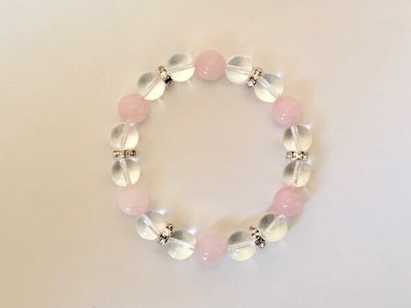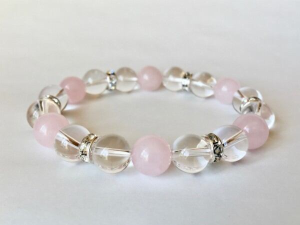 こちらは、10mm玉の水晶とローズクォーツを使用した天然石ブレスレットです。間にはロンデルを挟み高級感ある仕上がりです。石大きさは腕にも馴染みやすいように10mm玉で内周約17cm(伸可能)です。気になる方は是非この機会にどうぞ。