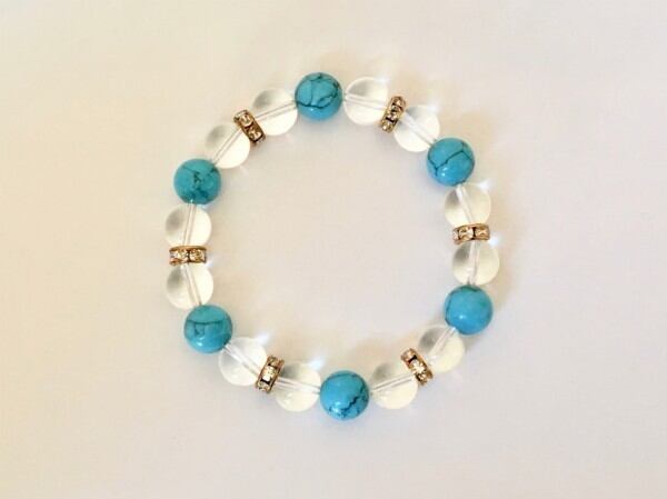 こちらは、10mm玉の水晶とターコイズを使用した天然石ブレスレットです。間にはロンデルを挟み高級感ある仕上がりです。石大きさは腕にも馴染みやすいように10mm玉で内周約17cm(伸可能)です。気になる方は是非この機会にどうぞ。