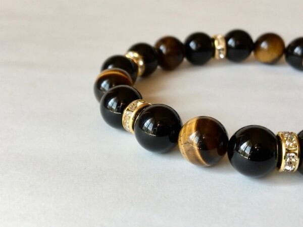 こちらは、10mm玉のオニキスとタイガーアイを使用した天然石ブレスレットです。間にはロンデルを挟み高級感ある仕上がりです。石大きさは腕にも馴染みやすいように10mm玉で内周約17cm(伸可能)です。気になる方は是非この機会にどうぞ。