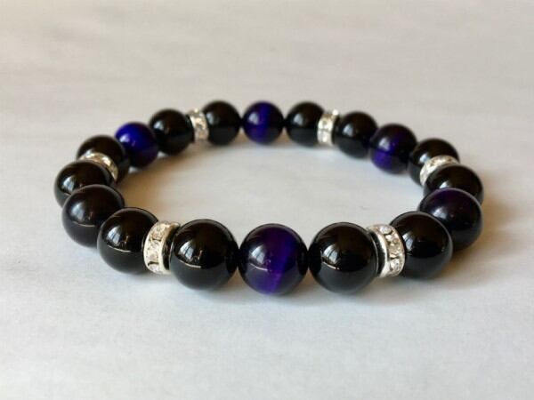 こちらは、10mm玉のオニキスとパープルタイガーアイを使用した天然石ブレスレットです。間にはロンデルを挟み高級感ある仕上がりです。石大きさは腕にも馴染みやすいように10mm玉で内周約17cm(伸可能)です。気になる方は是非この機会にどうぞ。
