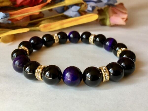 こちらは、10mm玉のオニキスとパープルタイガーアイを使用した天然石ブレスレットです。間にはロンデルを挟み高級感ある仕上がりです。石大きさは腕にも馴染みやすいように10mm玉で内周約17cm(伸可能)です。気になる方は是非この機会にどうぞ。