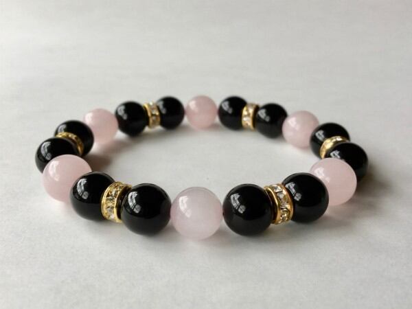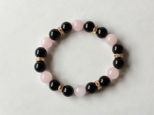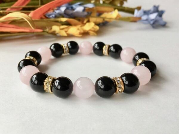 こちらは、10mm玉のオニキスとローズクォーツを使用した天然石ブレスレットです。間にはロンデルを挟み高級感ある仕上がりです。石大きさは腕にも馴染みやすいように10mm玉で内周約17cm(伸可能)です。気になる方は是非この機会にどうぞ。