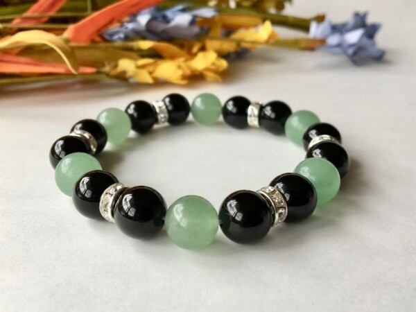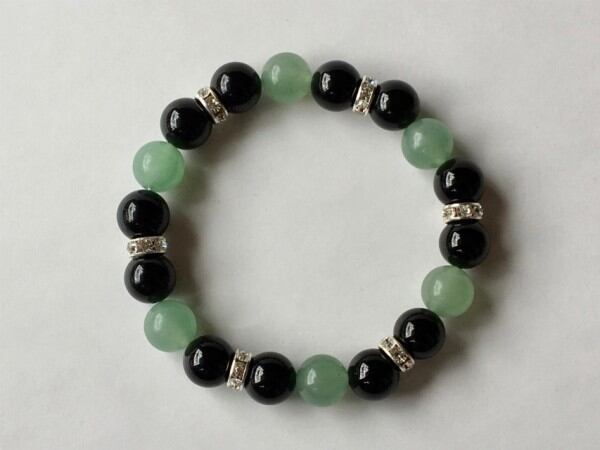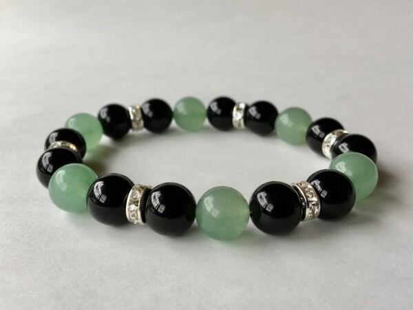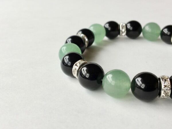 こちらは、10mm玉のオニキスとアベンチュリンを使用した天然石ブレスレットです。間にはロンデルを挟み高級感ある仕上がりです。石大きさは腕にも馴染みやすいように10mm玉で内周約17cm(伸可能)です。気になる方は是非この機会にどうぞ。