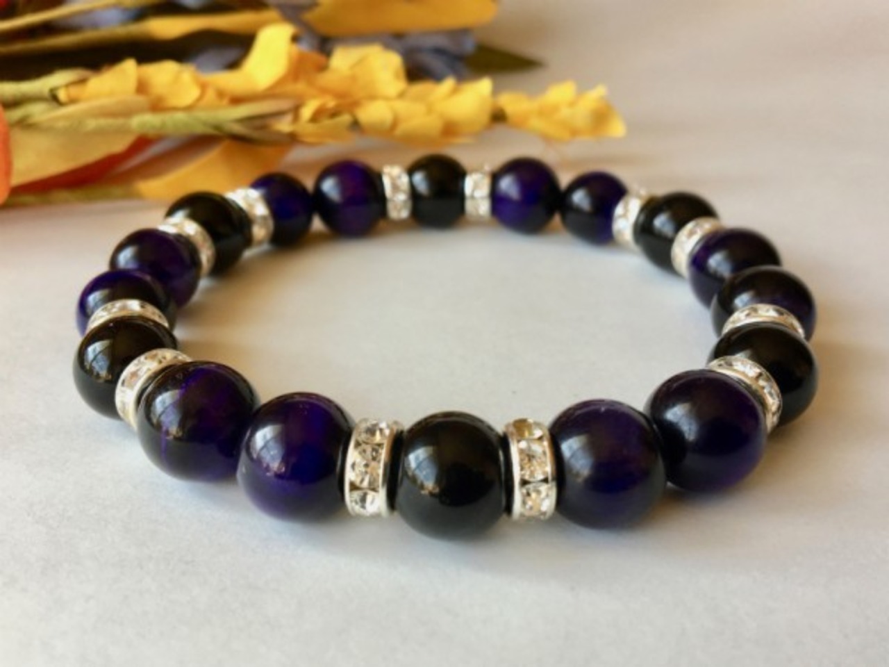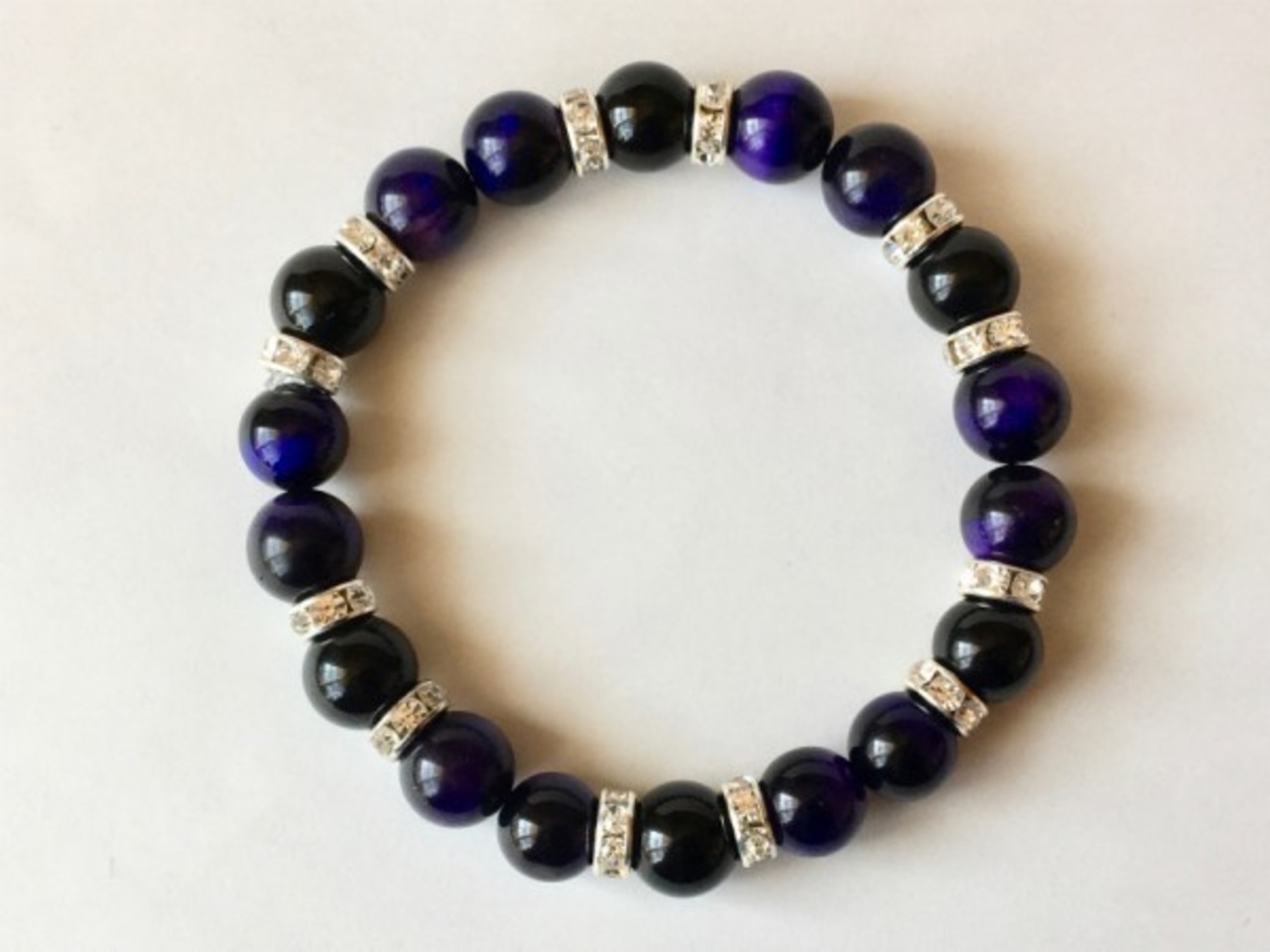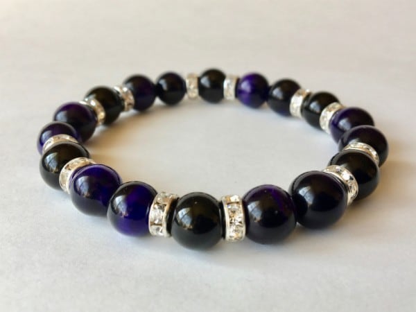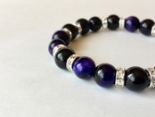 こちらは、10mm玉のパープルタイガーアイとオニキスを使用したブレスレットです。間にはロンデルが挟まれ高級感あるデザインです。石大きさは腕にも馴染みやすいように10mm玉で内周約18cm(伸可能)です。気になる方は是非この機会にどうぞ。