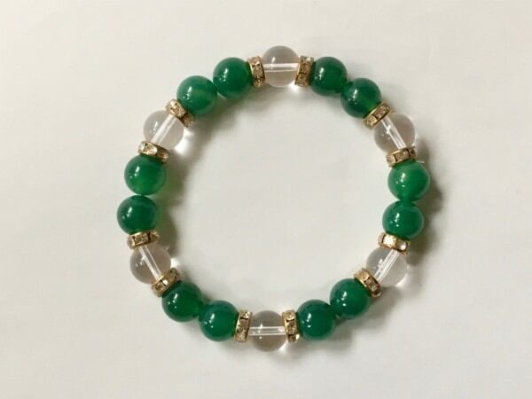 こちらは、10mm玉のグリーンメノウと水晶を使用したブレスレットです。間にはロンデルが挟まれ高級感あるデザインです。石大きさは腕にも馴染みやすいように10mm玉で内周約18cm(伸可能)です。気になる方は是非この機会にどうぞ。