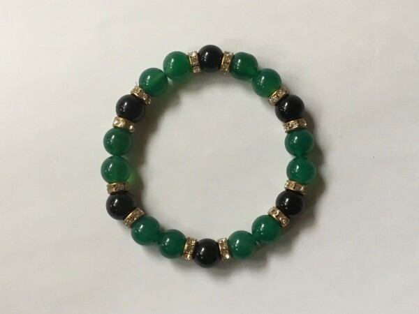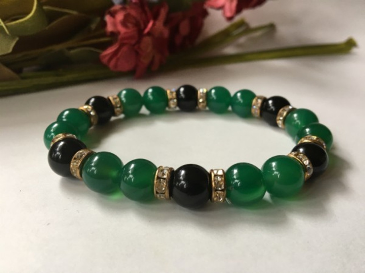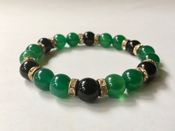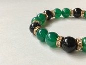 こちらは、10mm玉のグリーンメノウとオニキスを使用したブレスレットです。間にはロンデルが挟まれ高級感あるデザインです。石大きさは腕にも馴染みやすいように10mm玉で内周約18cm(伸可能)です。気になる方は是非この機会にどうぞ。