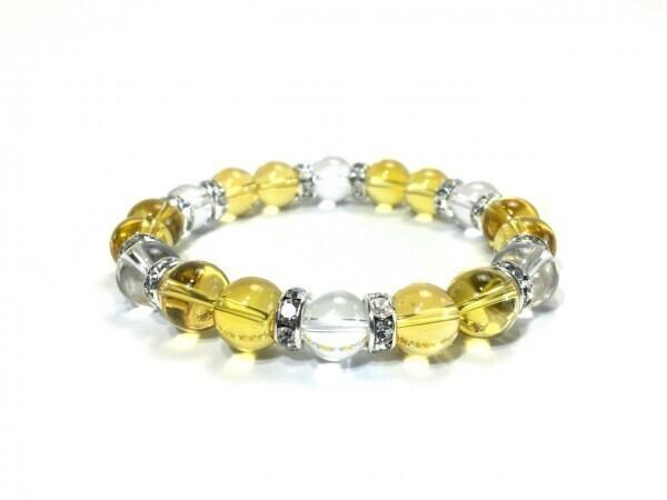 こちらは、10mm玉のシトリンと水晶を使用したブレスレットです。間にはロンデルが挟まれ高級感あるデザインです。石大きさは腕にも馴染みやすいように10mm玉で内周約18cm(伸可能)です。気になる方は是非この機会にどうぞ。