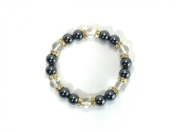 こちらは、10mm玉のヘマタイトと水晶を使用したブレスレットです。間にはロンデルが挟まれ高級感あるデザインです。石大きさは腕にも馴染みやすいように10mm玉で内周約18cm(伸可能)です。気になる方は是非この機会にどうぞ。