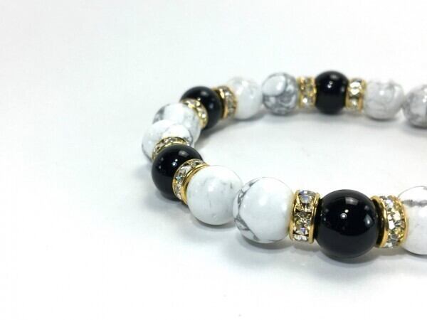 こちらは、10mm玉のハウライトとオニキスを使用したブレスレットです。間にはロンデルが挟まれ高級感あるデザインです。石大きさは腕にも馴染みやすいように10mm玉で内周約18cm(伸可能)です。気になる方は是非この機会にどうぞ。