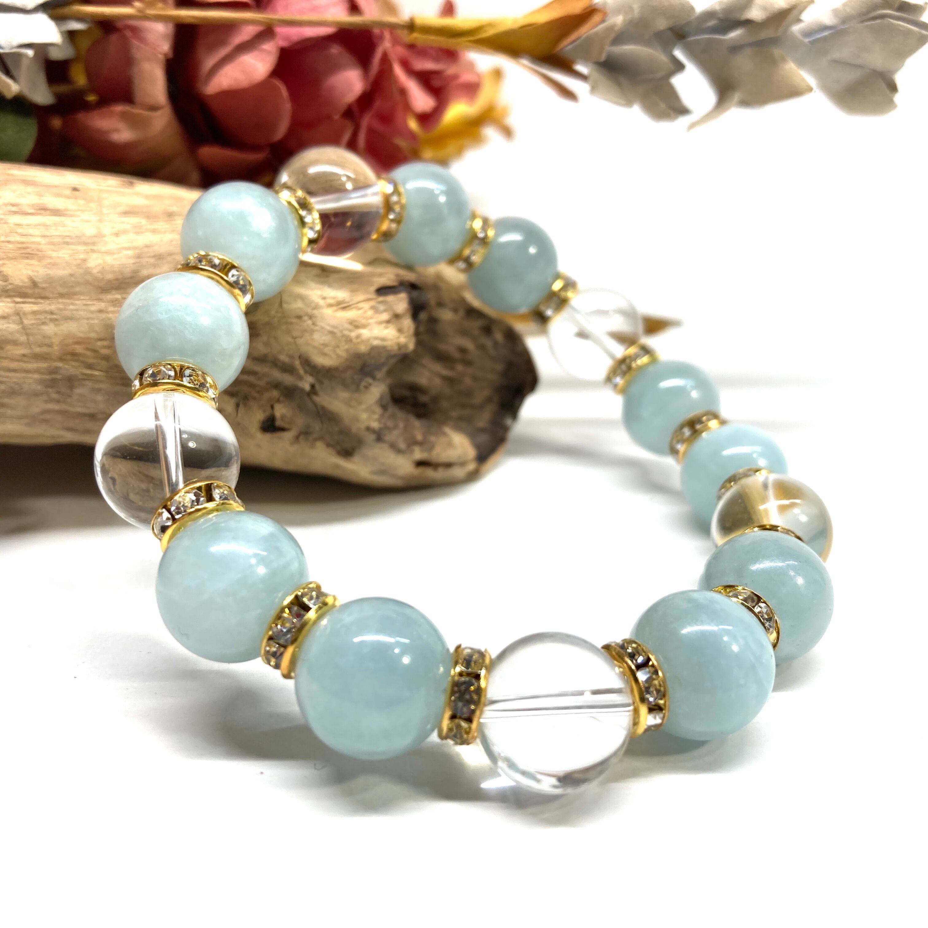 アクアマリン&水晶 パワーストーン ブレスレット 12mm (ゴールド)メンズ・レディース 男性・女性 数珠ブレス 開運 ☆