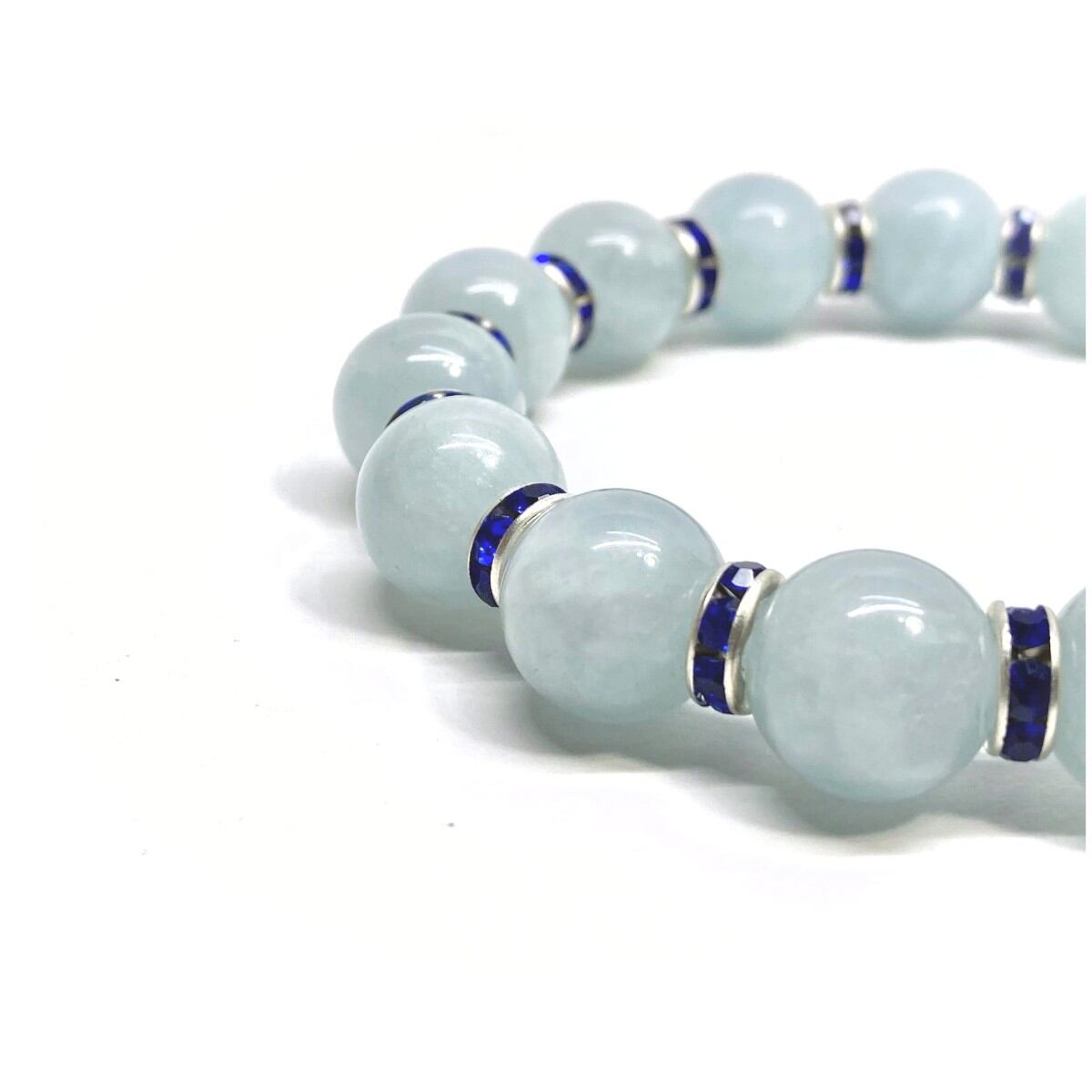 こちらは、12mm玉のアクアマリンを使用したパワーストーンブレスレットです。間にはロンデルを挟み高級感を演出しております。男女問わずどんなコーディネートとも合わせ易いブレスレットです。サイズは内周約18cmです。 数に限りがございますので気になる方はお早めにどうぞ