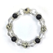 こちらは、ダルメシアンジャスパーと水晶とオニキスを組み合わせたブレスレットです。間にはロンデルを挟み高級感あるデザインに仕上がっています。石大きさは腕にも馴染みやすいように10mm玉で内周約16cmです。数に限りがございますので気になる方はお早めにどうぞ。