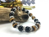 こちらは、タイガーアイとオニキスを組み合わせたブレスレットです。間にはロンデルを挟み高級感あるデザインに仕上がっています。石大きさは腕にも馴染みやすいように10mm玉で内周約16cm(伸可能)です。数に限りがございますので気になる方はお早めにどうぞ。