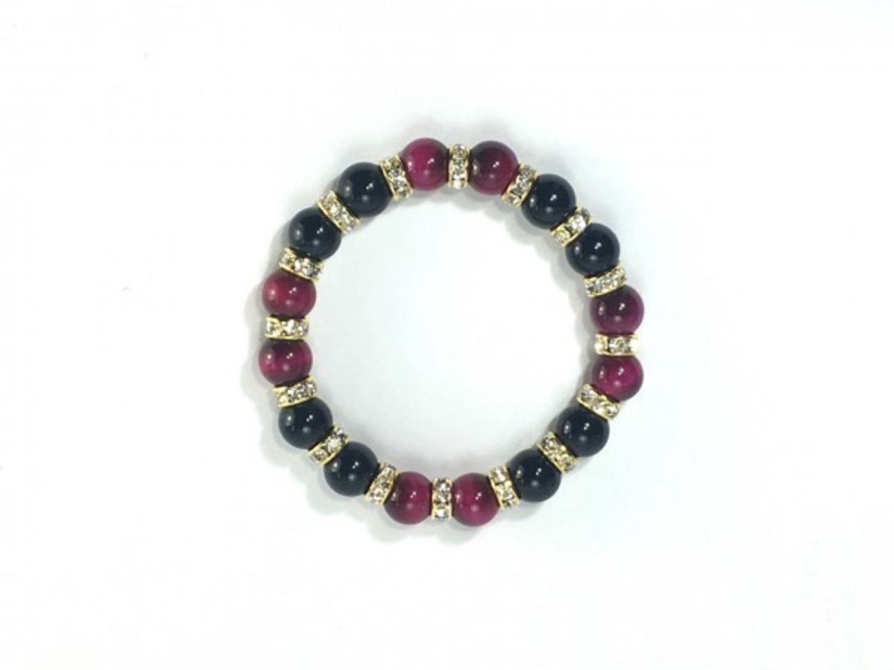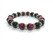 こちらは、ピンクタイガーアイとオニキスを組み合わせたブレスレットです。間にはロンデルを挟み高級感あるデザインに仕上がっています。石大きさは腕にも馴染みやすいように10mm玉で内周約16cm(伸可能)です。数に限りがございますので気になる方はお早めにどうぞ。