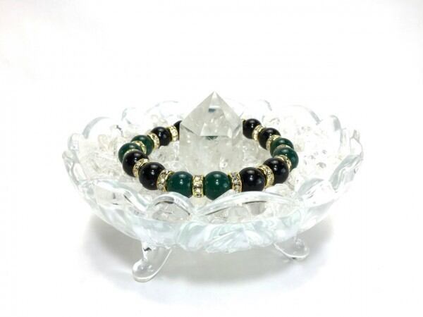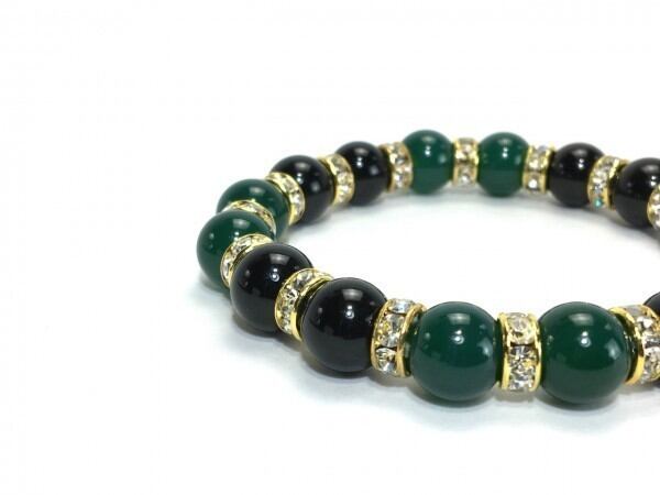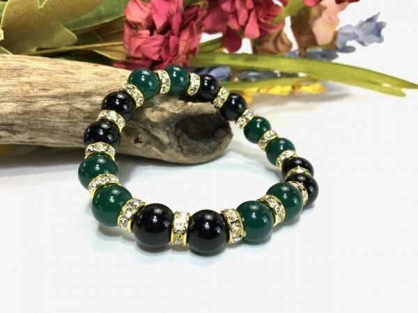 こちらは、緑瑪瑙とオニキスを組み合わせたブレスレットです。間にはロンデルを挟み高級感あるデザインに仕上がっています。石大きさは腕にも馴染みやすいように10mm玉で内周約16cm(伸可能)です。数に限りがございますので気になる方はお早めにどうぞ。