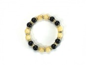 こちらは、アラゴナイトとオニキスを組み合わせたブレスレットです。間にはロンデルを挟み高級感あるデザインに仕上がっています。石大きさは腕にも馴染みやすいように10mm玉で内周約16cm(伸可能)です。数に限りがございますので気になる方はお早めにどうぞ。