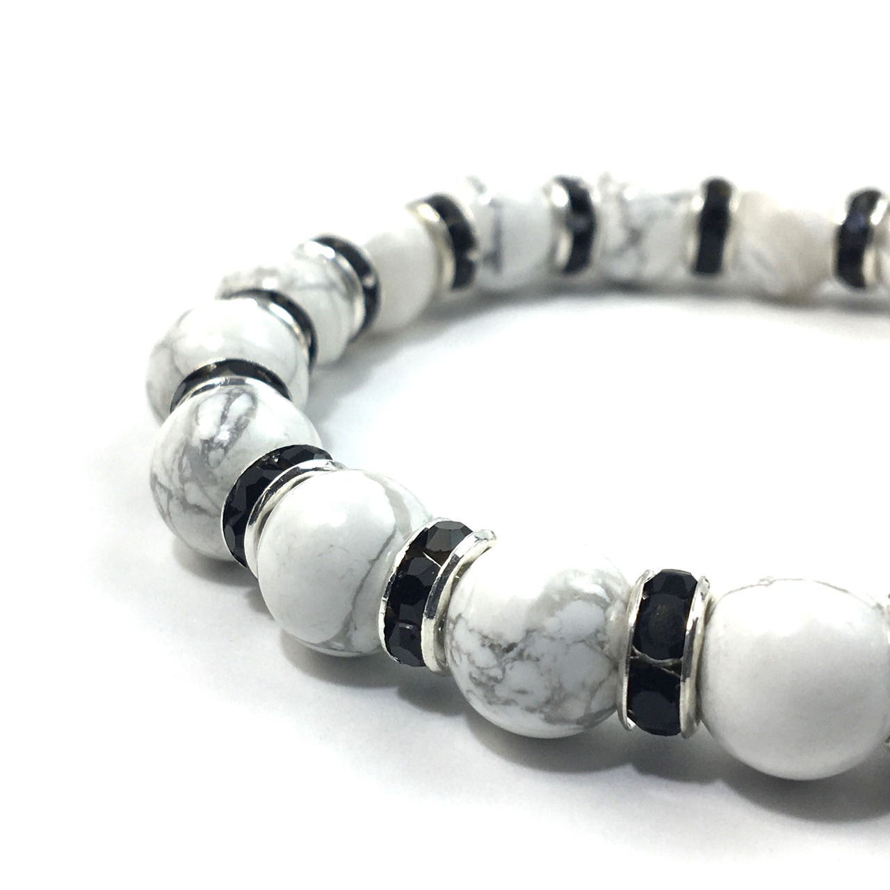 こちらは、ハウライトの10mm玉を使用したパワーストーンブレスレットです。石との間にはロンデルを挟み高級感を演出しております。シンプルなデザインは、シーン問わずどんなコーディネートとも合わせ易いブレスレットです。サイズは種類を選択からお選びください。(内周約14cm?内周約22cmでお選び頂けます)当社の中でも一番人気の実績があるデザインとなっております。気になる方はお早めにどうぞ。