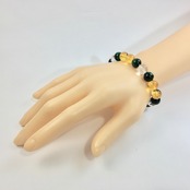 こちらは、水晶とグリーンタイガーアイとシトリンを使用したパワーストーンブレスレットです。今回はパーツは使わずシンプルに石のみでデザインしてあります。パーツを使っていないので金属アレルギーの方などにもオススメできるブレスレットです。石の大きさは全て10mm玉を使用して内径約17cmです。数に限りがございますので気になる方はお早めにどうぞ。