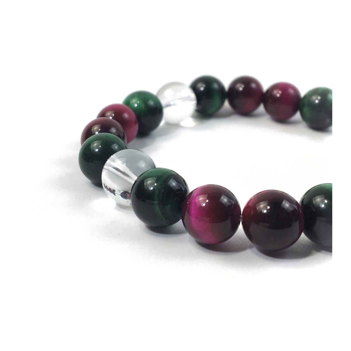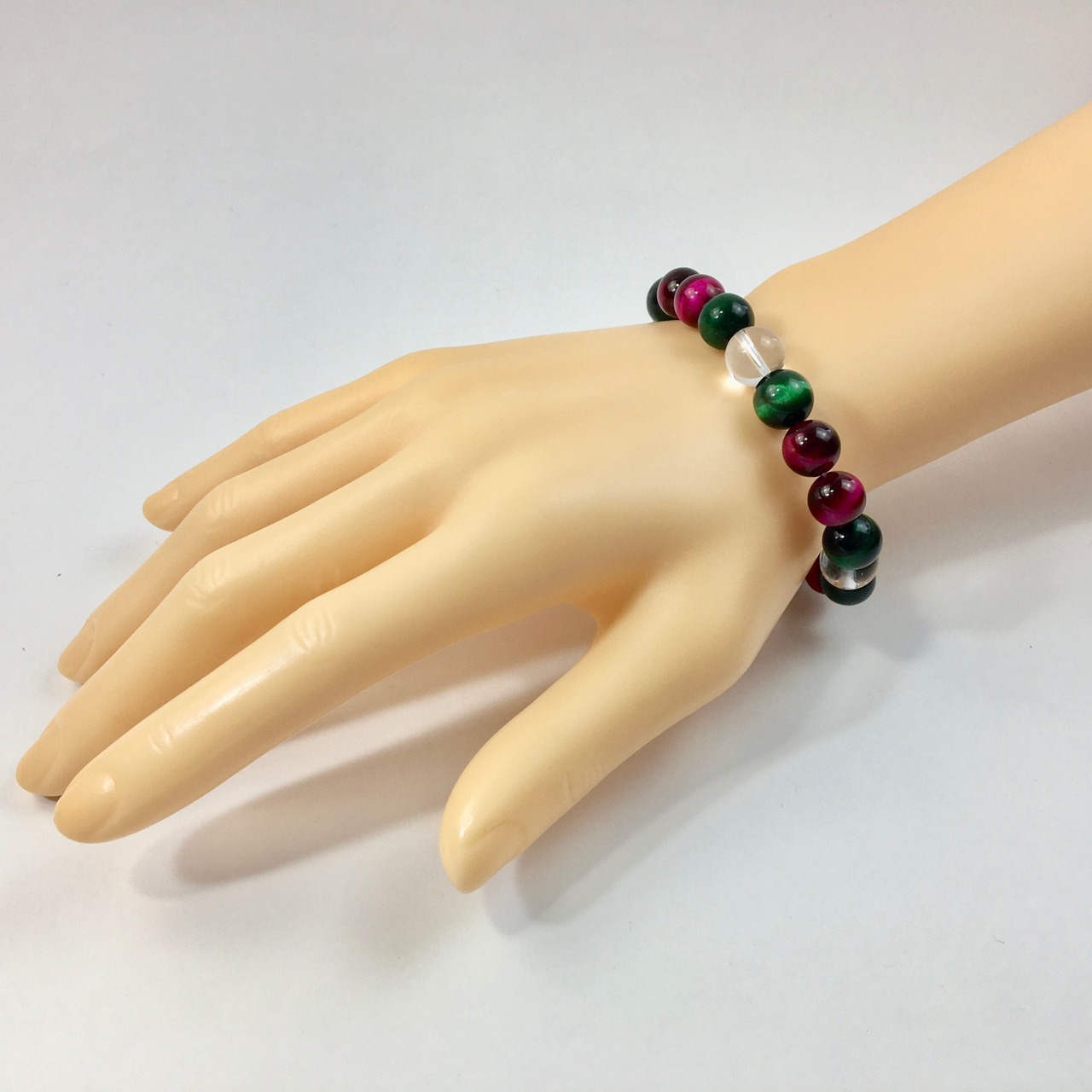 こちらは、水晶とグリーンタイガーアイとピンクタイガーアイを使用したパワーストーンブレスレットです。今回はパーツは使わずシンプルに石のみでデザインしてあります。パーツを使っていないので金属アレルギーの方などにもオススメできるブレスレットです。石の大きさは全て10mm玉を使用して内径約17cmです。数に限りがございますので気になる方はお早めにどうぞ。
