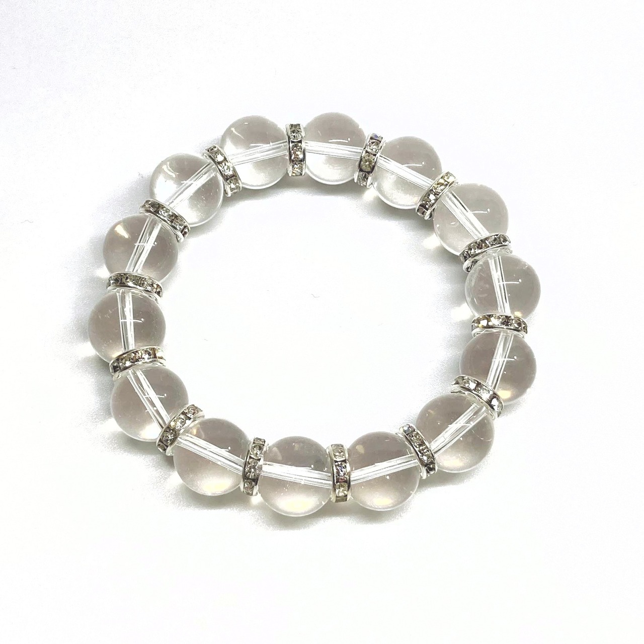 こちらは、14mm玉の水晶を使用した天然石ブレスレットです。シンプルなデザインですのでどんなコーディネートとも合わせ易いブレスレットです。石との間にはロンデルを挟み高級感を演出しています。石大きさはインパクトを与えてくれる大きさの14mm玉を使用しています。内周約17cmです。数に限りがございますので気になる方はお早めにどうぞ。