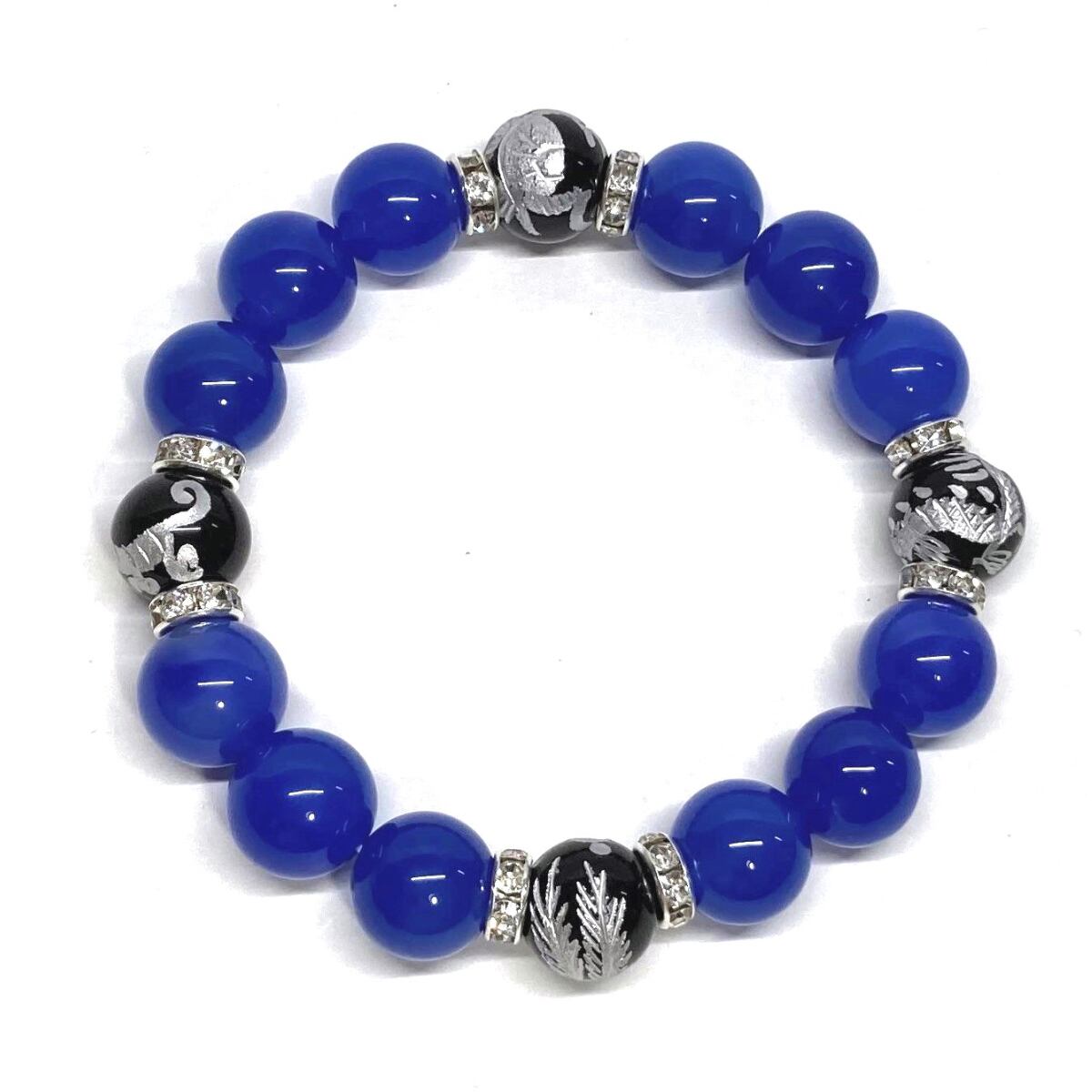 12mm 四神獣銀彫オニキス×青瑪瑙 パワーストーン ブレスレット天然石 運気上昇 開運 ☆ 金運 健康運 お守り 青龍 白虎 玄武 朱雀 (シルバー)メンズ・レディース 男性・女性 数珠ブレス 開運 ☆ | パワーストーン 天然石 Kinari&Co.