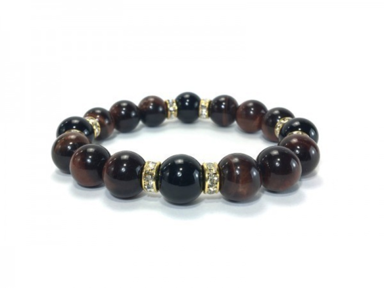 こちらは、12mm玉のレッドタイガーアイとオニキスを使用した天然石ブレスレットです。石との間にはロンデルを挟み高級感を演出しています。シンプルなデザインですのでどんなコーディネートとも合わせ易いブレスレットです。石大きさは12mm玉です。内周約18cmです。気になる方は是非この機会にどうぞ。