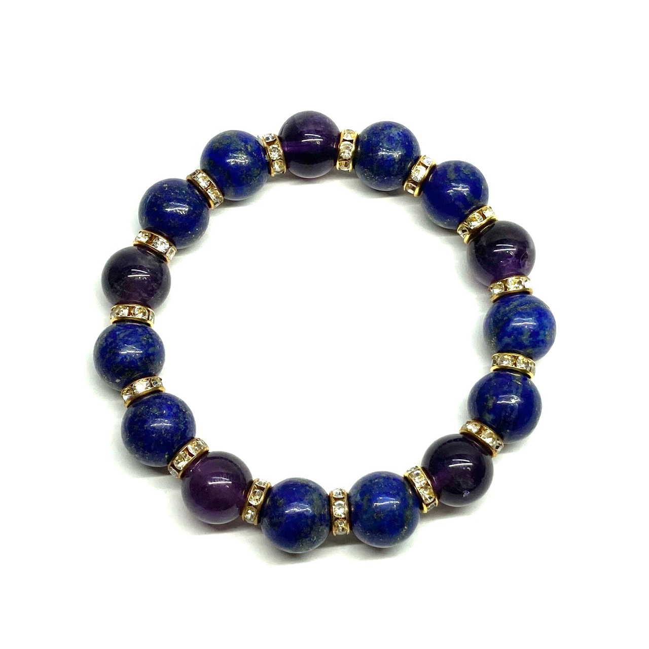 こちらは、ラピスラズリとアメジストを組み合わせたパワーストーンブレスレットです。間にはロンデルを挟み高級感あるデザインに仕上げております。石大きさは12mm玉を使用して内周 約18cmです。気になる方は是非この機会にどうぞ。