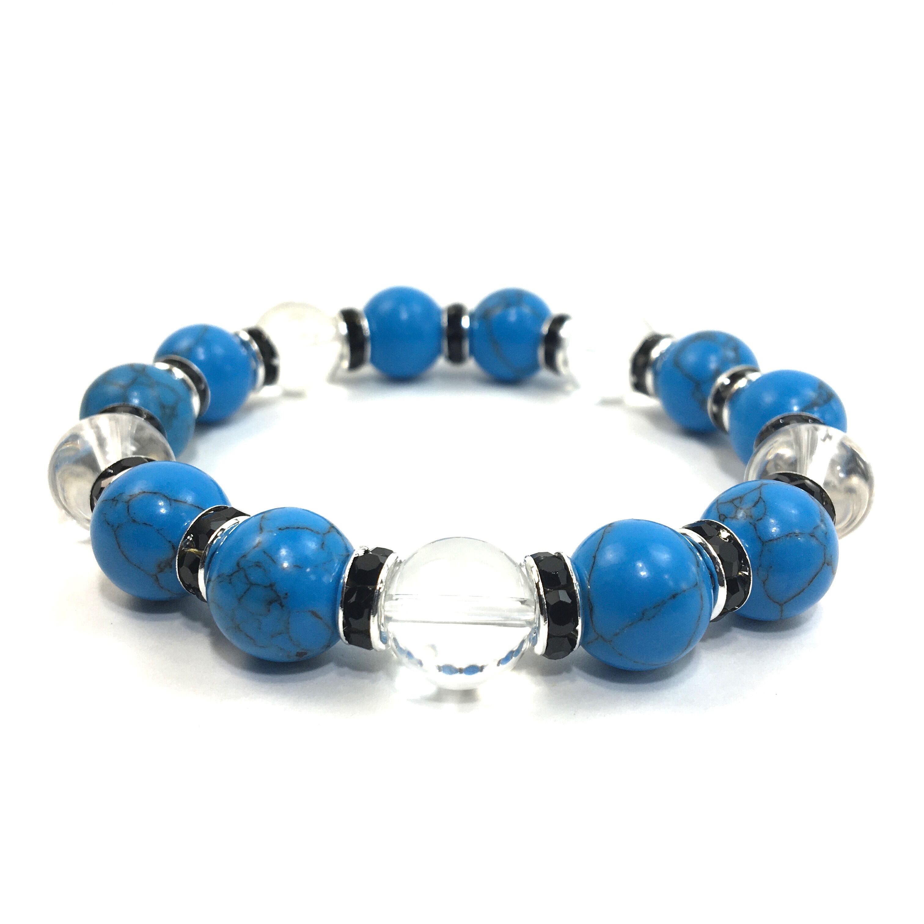 ターコイズ&水晶 パワーストーン ブレスレット 12mm (ブラック)メンズ・レディース 男性・女性 数珠ブレス 開運 ☆