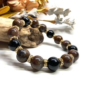 こちらは、10mm玉のピーターサイトとオニキスを組み合わせたパワーストーンブレスレットです。間にはロンデルを挟み高級感あるデザインに仕上げております。石大きさは12mm玉を使用して内径約18cmです。数に限りがございますので気になる方はお早めにどうぞ。