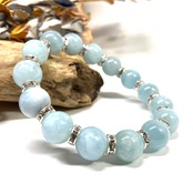こちらは、12mm玉のアクアマリンを使用したパワーストーンブレスレットです。間にはロンデルを挟み高級感を演出しております。男女問わずどんなコーディネートとも合わせ易いブレスレットです。サイズは内周約18cmです。 数に限りがございますので気になる方はお早めにどうぞ