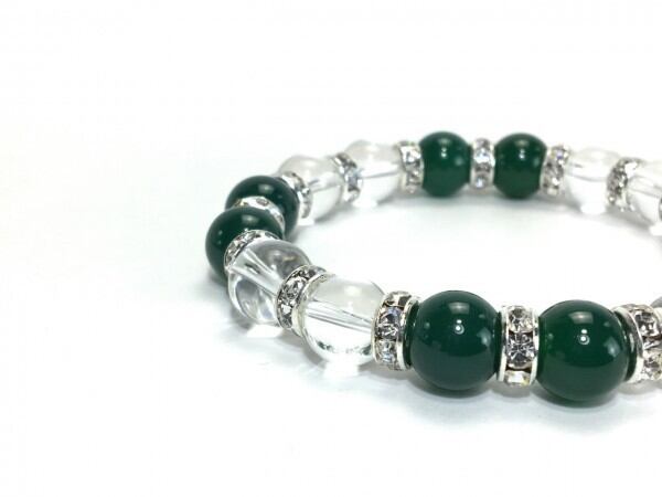 こちらは、緑瑪瑙と水晶を組み合わせたブレスレットです。間にはロンデルを挟み高級感あるデザインに仕上がっています。石大きさは腕にも馴染みやすいように10mm玉で内周約16cm(伸可能)です。数に限りがございますので気になる方はお早めにどうぞ。