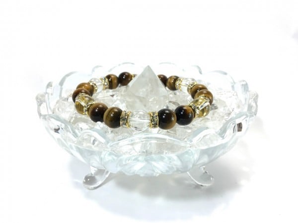 こちらは、タイガーアイと水晶を組み合わせたブレスレットです。間にはロンデルを挟み高級感あるデザインに仕上がっています。石大きさは腕にも馴染みやすいように10mm玉で内周約17cm(伸可能)です。数に限りがございますので気になる方はお早めにどうぞ。