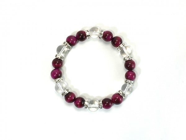 こちらは、ピンクタイガーアイと水晶を組み合わせたブレスレットです。間にはロンデルを挟み高級感あるデザインに仕上がっています。石大きさは腕にも馴染みやすいように10mm玉で内周約17cm(伸可能)です。数に限りがございますので気になる方はお早めにどうぞ。