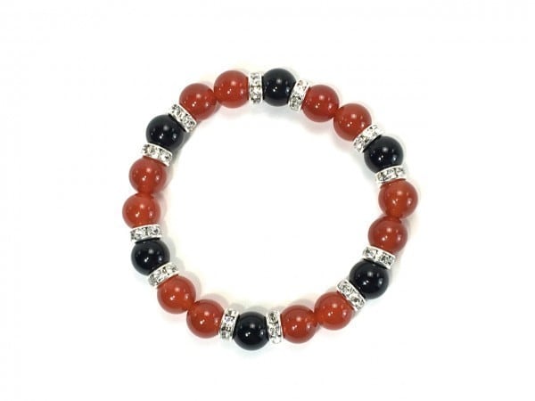 こちらは、赤瑪瑙とオニキスを組み合わせたブレスレットです。間にはロンデルを挟み高級感あるデザインに仕上がっています。石大きさは腕にも馴染みやすいように10mm玉で内周約17cm(伸可能)です。数に限りがございますので気になる方はお早めにどうぞ。