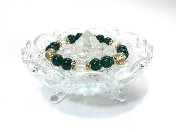 こちらは、緑瑪瑙と水晶を組み合わせたブレスレットです。間にはロンデルを挟み高級感あるデザインに仕上がっています。石大きさは腕にも馴染みやすいように10mm玉で内周約17cm(伸可能)です。数に限りがございますので気になる方はお早めにどうぞ。