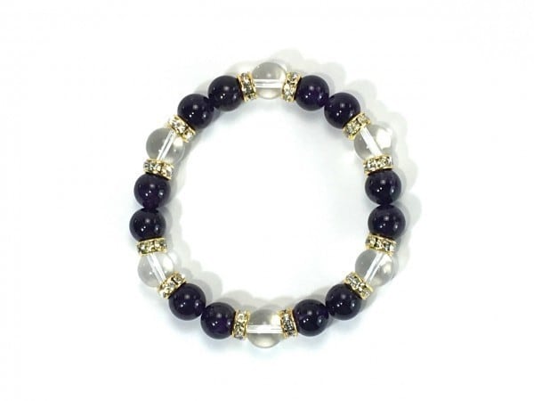 こちらは、アメジストと水晶を組み合わせたブレスレットです。間にはロンデルを挟み高級感あるデザインに仕上がっています。石大きさは腕にも馴染みやすいように10mm玉で内周約17cm(伸可能)です。数に限りがございますので気になる方はお早めにどうぞ。