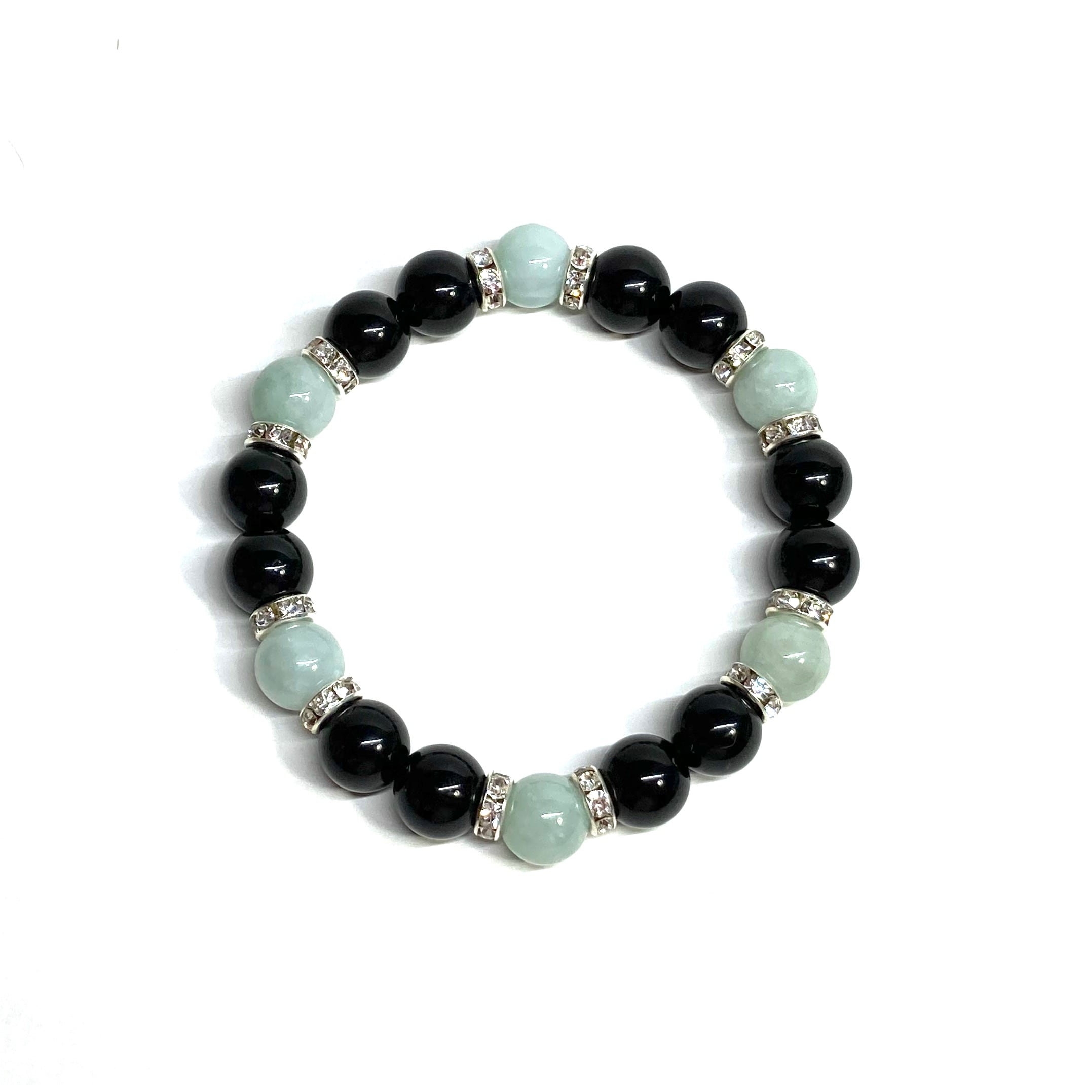 こちらは、モリオンとビルマ翡翠を組み合わせたパワーストーンブレスレットです。間にはロンデルを挟み高級感あるデザインに仕上げております。石大きさは腕にも馴染みやすいように10mm玉で内径約18cm(伸可能)です。 数に限りがございますので気になる方はお早めにどうぞ。