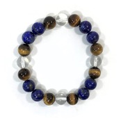こちらは、水晶とタイガーアイとラピスラズリ使用したパワーストーンブレスレットです。今回はパーツは使わずシンプルに石のみでデザインしてあります。パーツを使っていないので金属アレルギーの方などにもオススメできるブレスレットです。石の大きさは全て10mm玉を使用して内径約17cmです。数に限りがございますので気になる方はお早めにどうぞ。