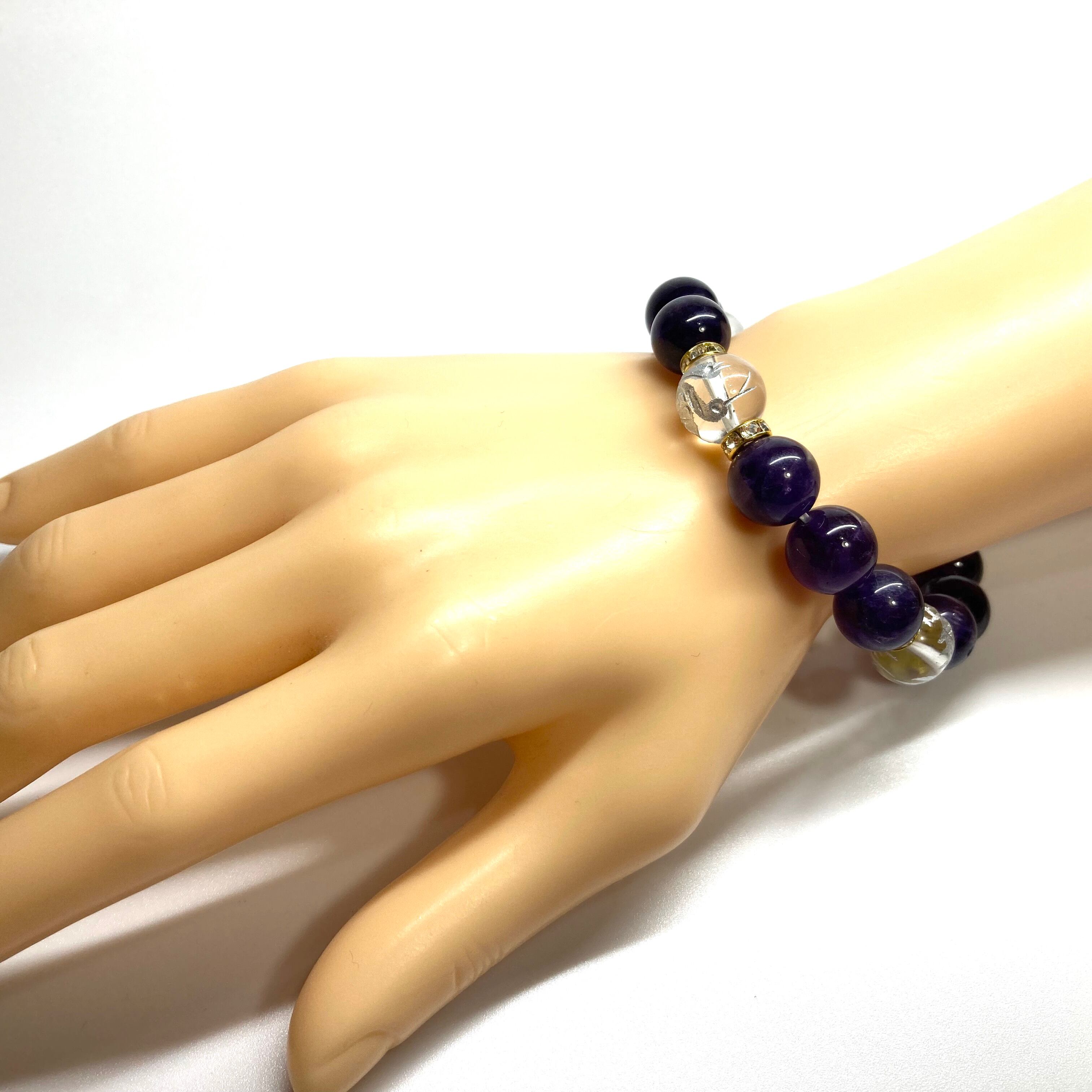 12mm 四神獣銀彫水晶×アメジスト パワーストーン ブレスレット天然石 運気上昇 開運 ☆ 恋愛運 お守り 青龍 白虎 玄武 朱雀 2月誕生石(ゴールド)メンズ・レディース 男性・女性 数珠ブレス 開運 ☆ | パワーストーン 天然石 Kinari&Co.