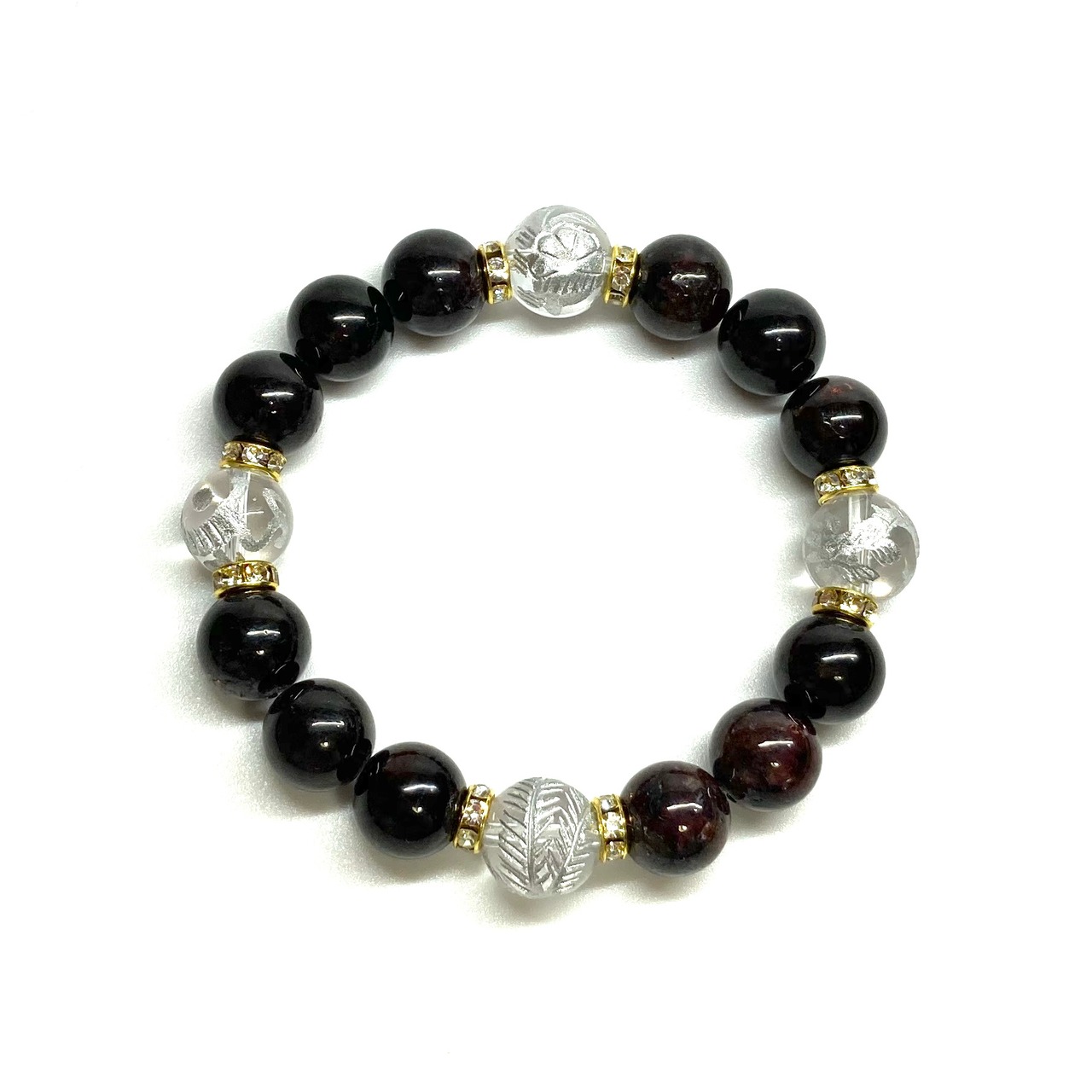 12mm 四神獣銀彫水晶×ガーネット パワーストーン ブレスレット天然石 運気上昇 開運 ☆ 恋愛運 お守り 青龍 白虎 玄武 朱雀 1月誕生石 (ゴールド)メンズ・レディース 男性・女性 数珠ブレス 開運 ☆ | パワーストーン 天然石 Kinari&Co.