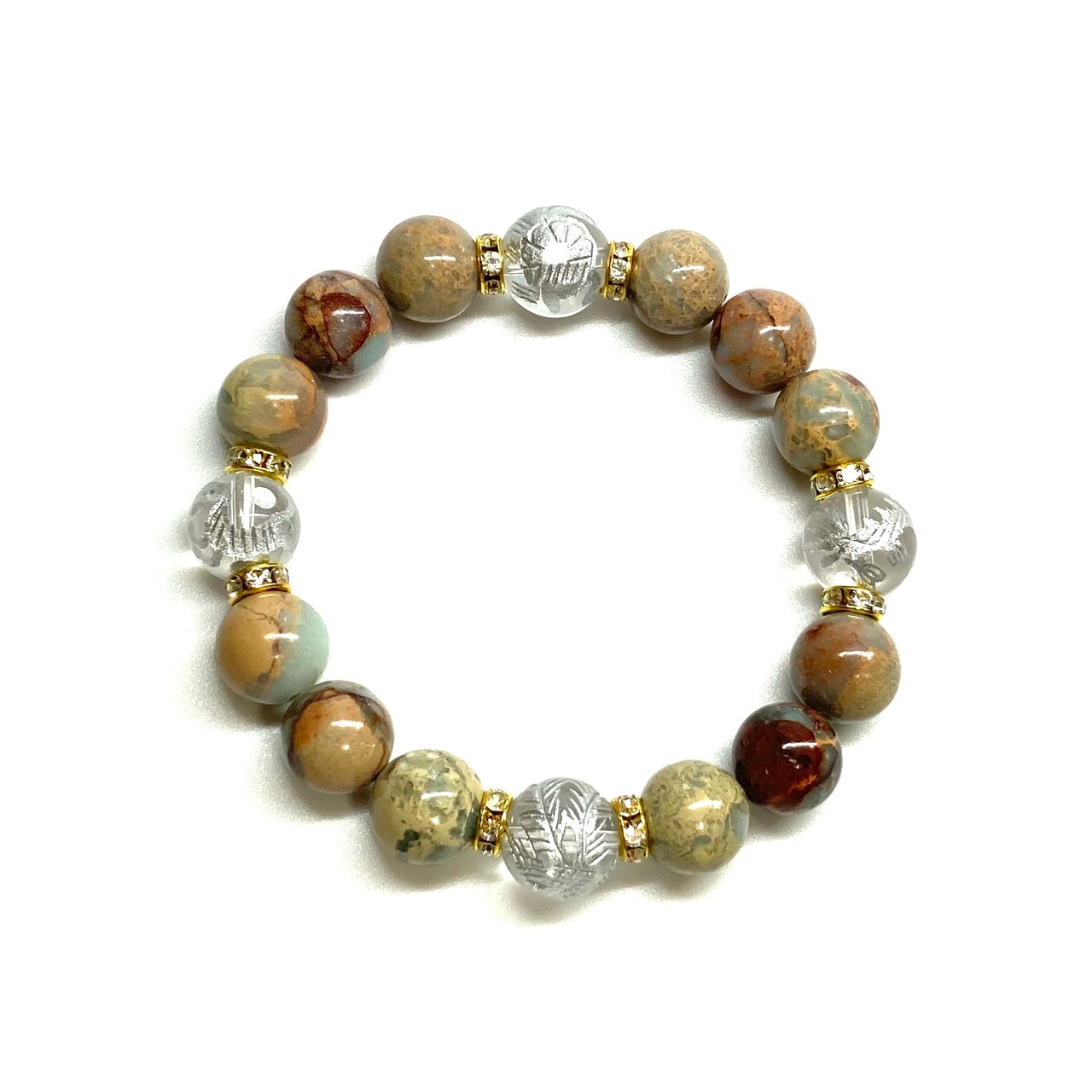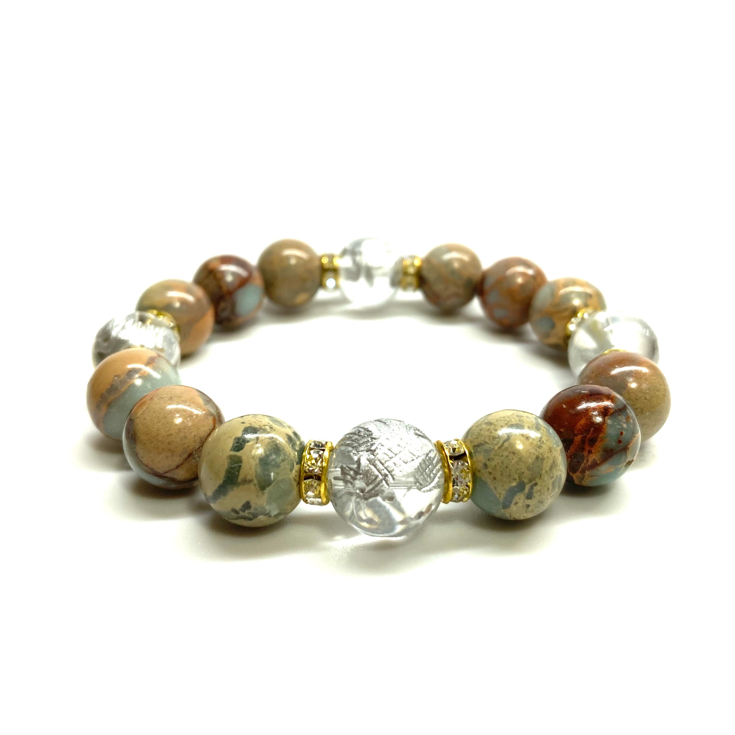 12mm 四神獣銀彫水晶×インプレッションストーン パワーストーン ブレスレット天然石 運気上昇 開運 ☆ お守り 青龍 白虎 玄武 朱雀 (ゴールド)メンズ・レディース 男性・女性 数珠ブレス 開運 ☆ | パワーストーン 天然石 Kinari&Co.